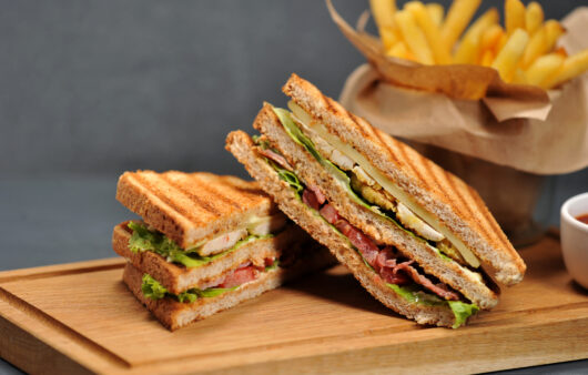 Club Sandwich, genellikle üç katlı bir sandviçtir ve tavuk, hindi, jambon, bacon, marullar, domates ve mayonez içerir. İşte basit bir